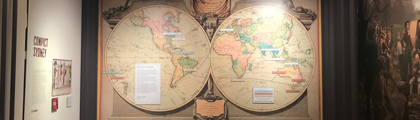 But the map that I found most striking at the Barracks was a large re-presentation of a map made in 1800 depicting the ‘Western’ and ‘Eastern’ Hemispheres. The map is used to mark the different European uses of convict transportation at various locations. This is interesting because it is possible to see French penal transportation in relation to other European colonial powers. Of course the main purpose is to emphasize the extent of transportation to Australia.