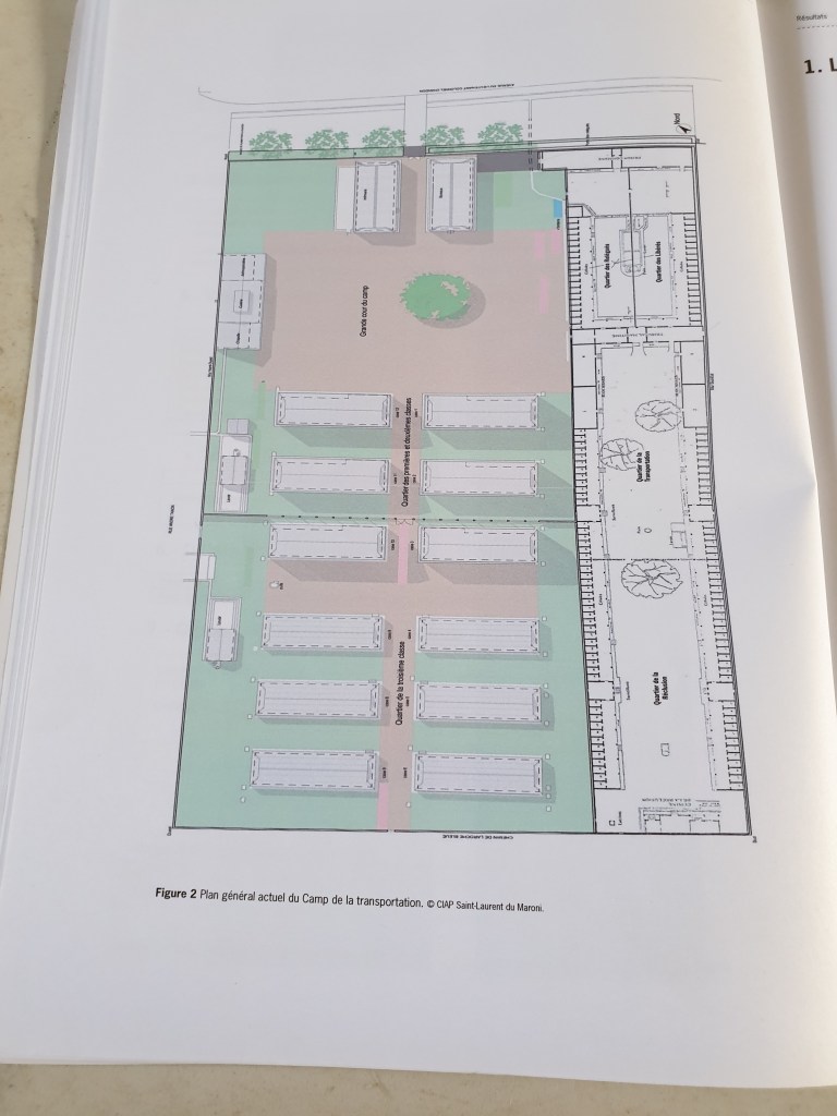 Whilst in the archive at the Camp du Transportation, I was lucky enough to find a document which detailed an archeological dig which took place at the site also in 2013. The file, as one would assume, detailed things found in the dig, the nature of soil, how deep they dug, and what their research entailed. The figure which was of interest however, was an aerial view plan of the site showing the location of barracks and buildings for their dig. The plan showed, in a scientific and detached way, the layout of the camp and some of its key characteristics.